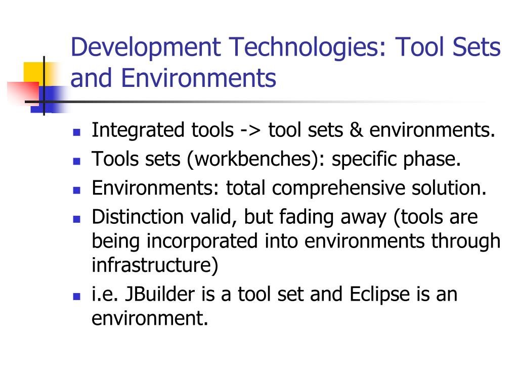 Development Technologies: Tool Sets and Environments • Integrated tools -> tool sets & environments. • Tools sets (workbenches): specific phase. • Environments: total comprehensive solution. • Distinction valid, but fading away (tools are being incorporated into environments through infrastructure) • i.e. JBuilder is a tool set and Eclipse is an environment.