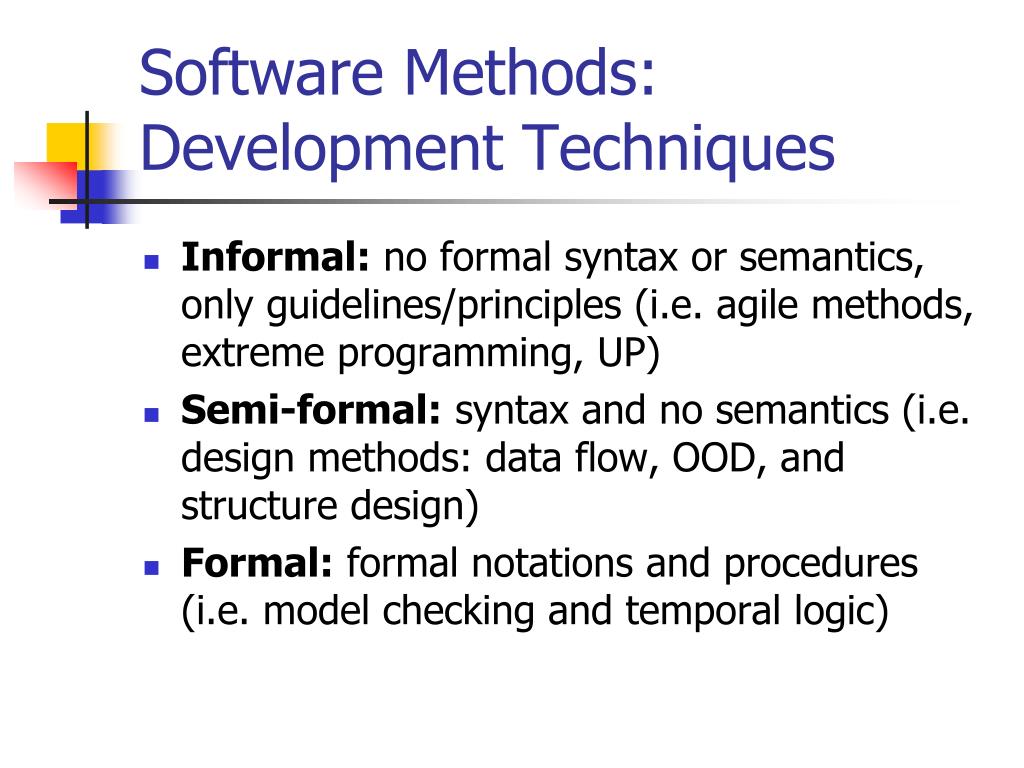 Software Methods: Development Techniques • Informal: no formal syntax or semantics, only guidelines/principles (i.e. agile methods, extreme programming, UP) • Semi-formal: syntax and no semantics (i.e. design methods: data flow, OOD, and structure design) • Formal: formal notations and procedures (i.e. model checking and temporal logic)