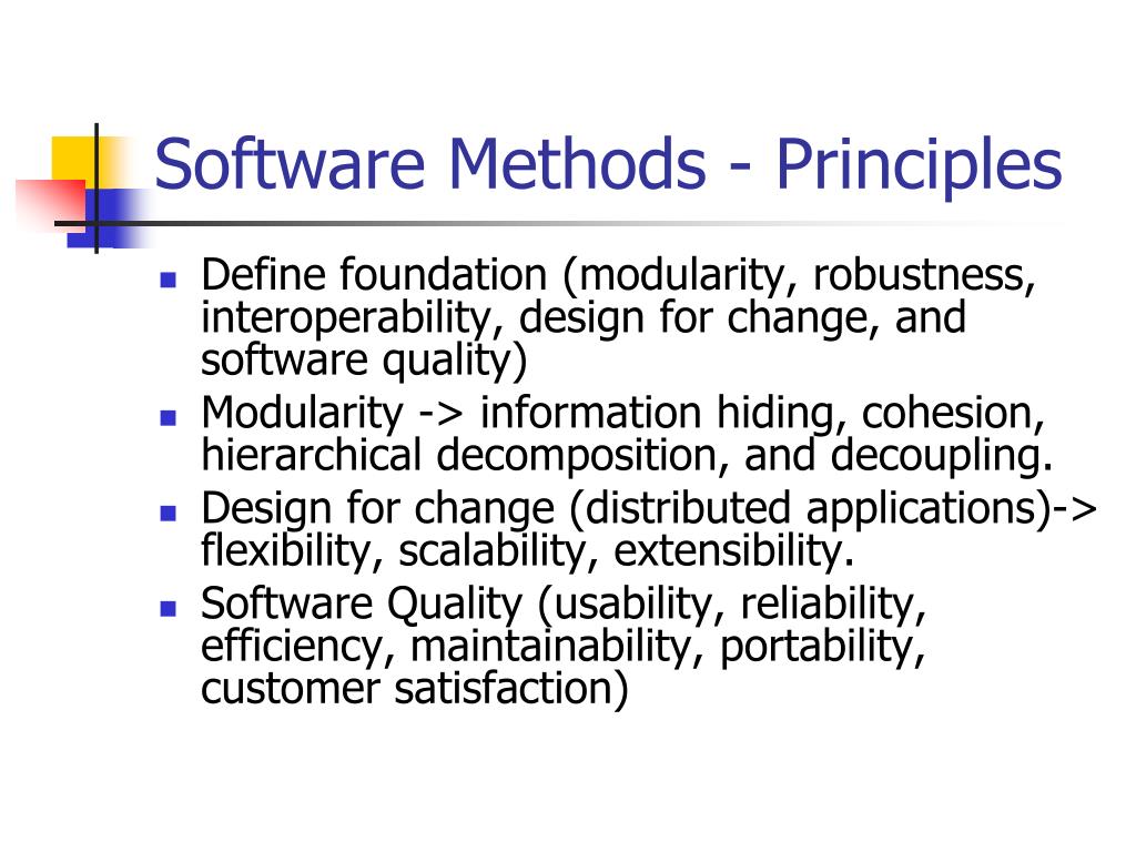 Software Methods - Principles • Define foundation (modularity, robustness, interoperability, design for change, and software quality) • Modularity -> information hiding, cohesion, hierarchical decomposition, and decoupling. • Design for change (distributed applications)-> flexibility, scalability, extensibility. • Software Quality (usability, reliability, efficiency, maintainability, portability, customer satisfaction)