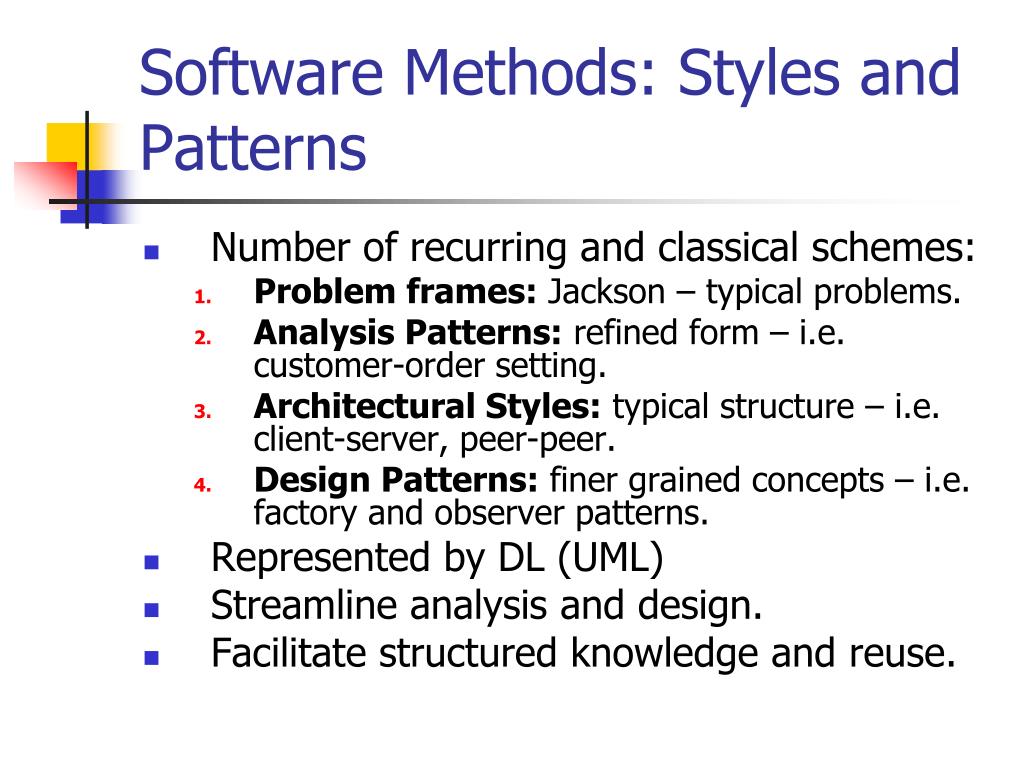 Software Methods: Styles and Patterns • Number of recurring and classical schemes: • Problem frames: Jackson – typical problems. • Analysis Patterns: refined form – i.e. customer-order setting. • Architectural Styles: typical structure – i.e. client-server, peer-peer. • Design Patterns: finer grained concepts – i.e. factory and observer patterns. • Represented by DL (UML) • Streamline analysis and design. • Facilitate structured knowledge and reuse.