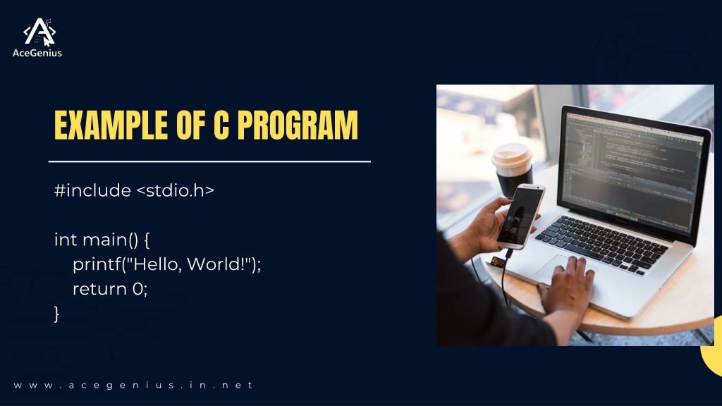 EXAMPLE OF C PROGRAM #include <stdio.h> int main() { printf("Hello, World!"); return 0; } www.acegenius.in.net