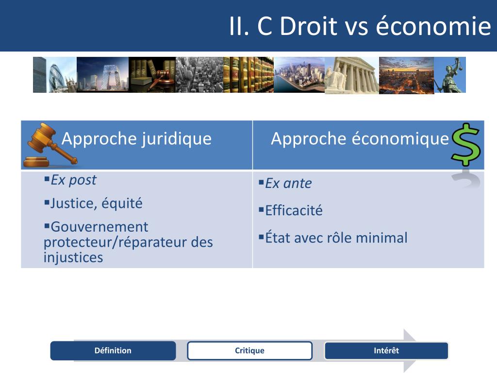 II. C Droit vs économie • Incompatibilité entre discours économique et droit ? • L’économie ne voit le marché comme le seul horizon possible • Le droit est le lieu de la discussion