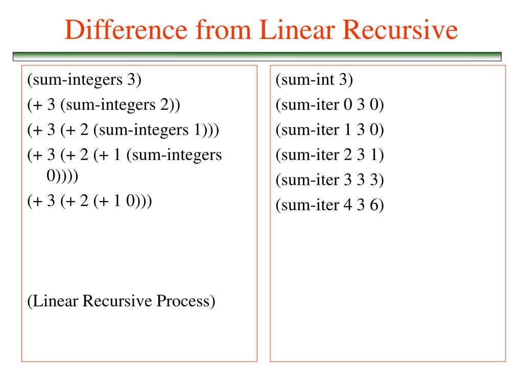 (sum-integers 3) (+ 3 (sum-integers 2)) (+ 3 (+ 2 (sum-integers 1))) (+ 3 (+ 2 (+ 1 (sum-integers 0)))) (+ 3 (+ 2 (+ 1 0))) (Linear Recursive Process) (sum-int 3) (sum-iter 0 3 0) (sum-iter 1 3 0) (sum-iter 2 3 1) (sum-iter 3 3 3) (sum-iter 4 3 6) Difference from Linear Recursive