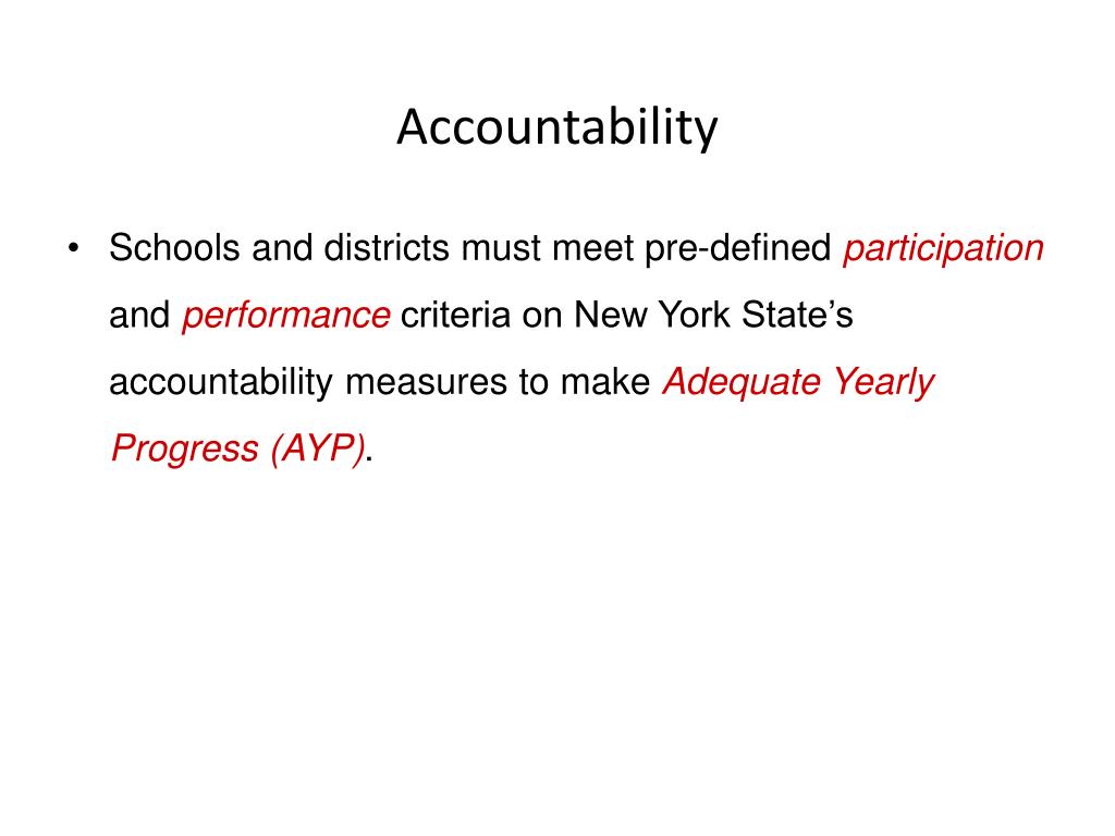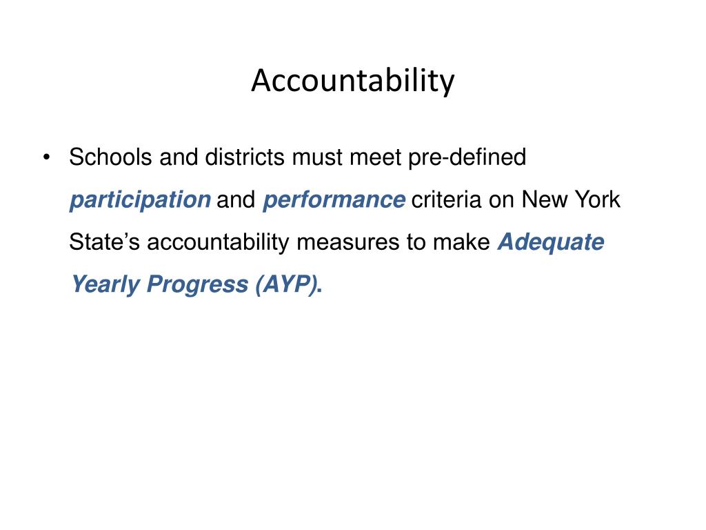 Accountability • Schools and districts must meet pre-defined participationand performance criteria on New York State’s accountability measures to make Adequate Yearly Progress (AYP).