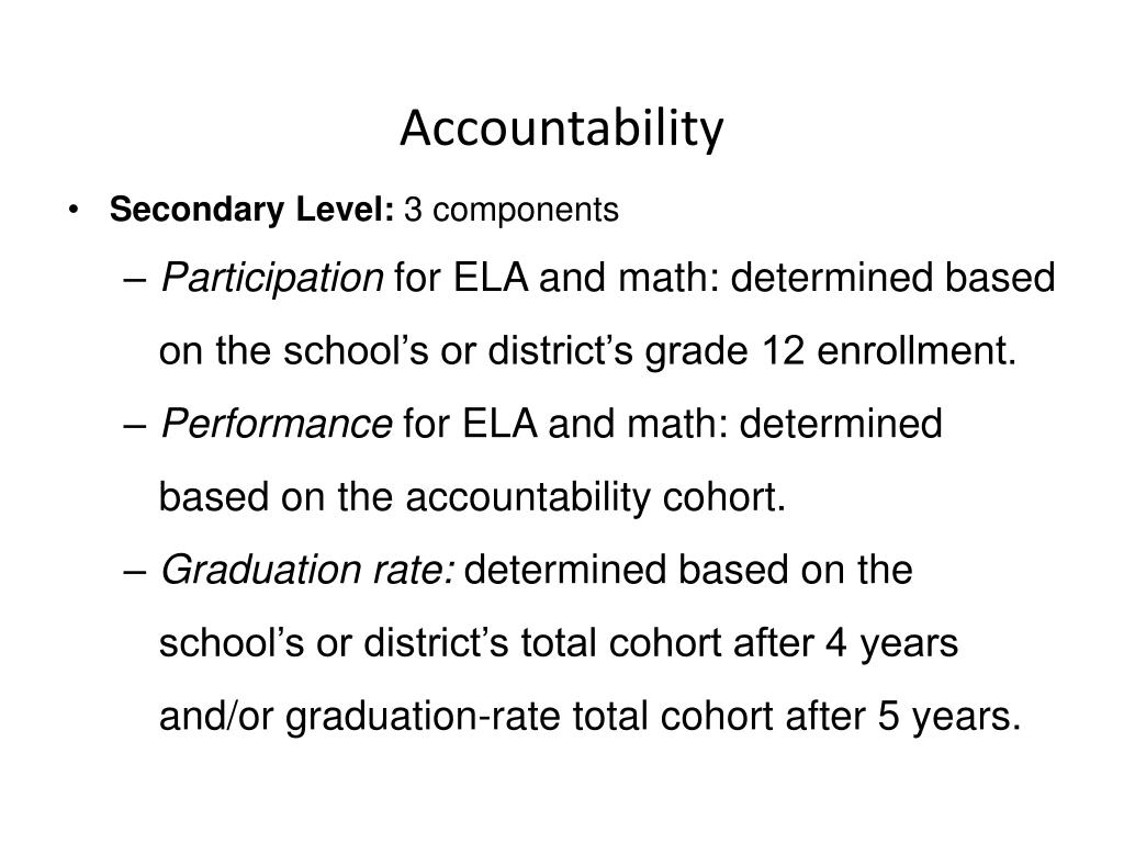 Accountability • Secondary Level: 3 components • Participation for ELA and math: determined based on the school’s or district’s grade 12 enrollment. • Performance for ELA and math: determined based on the accountability cohort. • Graduation rate: determined based on the school’s or district’s total cohort after 4 years and/or graduation-rate total cohort after 5 years.