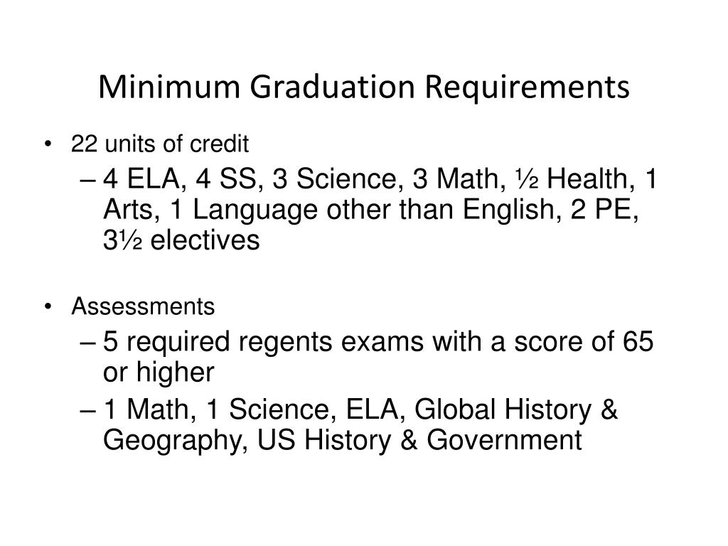 Minimum Graduation Requirements • 22 units of credit • 4 ELA, 4 SS, 3 Science, 3 Math, ½ Health, 1 Arts, 1 Language other than English, 2 PE, 3½ electives • Assessments • 5 required regents exams with a score of 65 or higher • 1 Math, 1 Science, ELA, Global History & Geography, US History & Government
