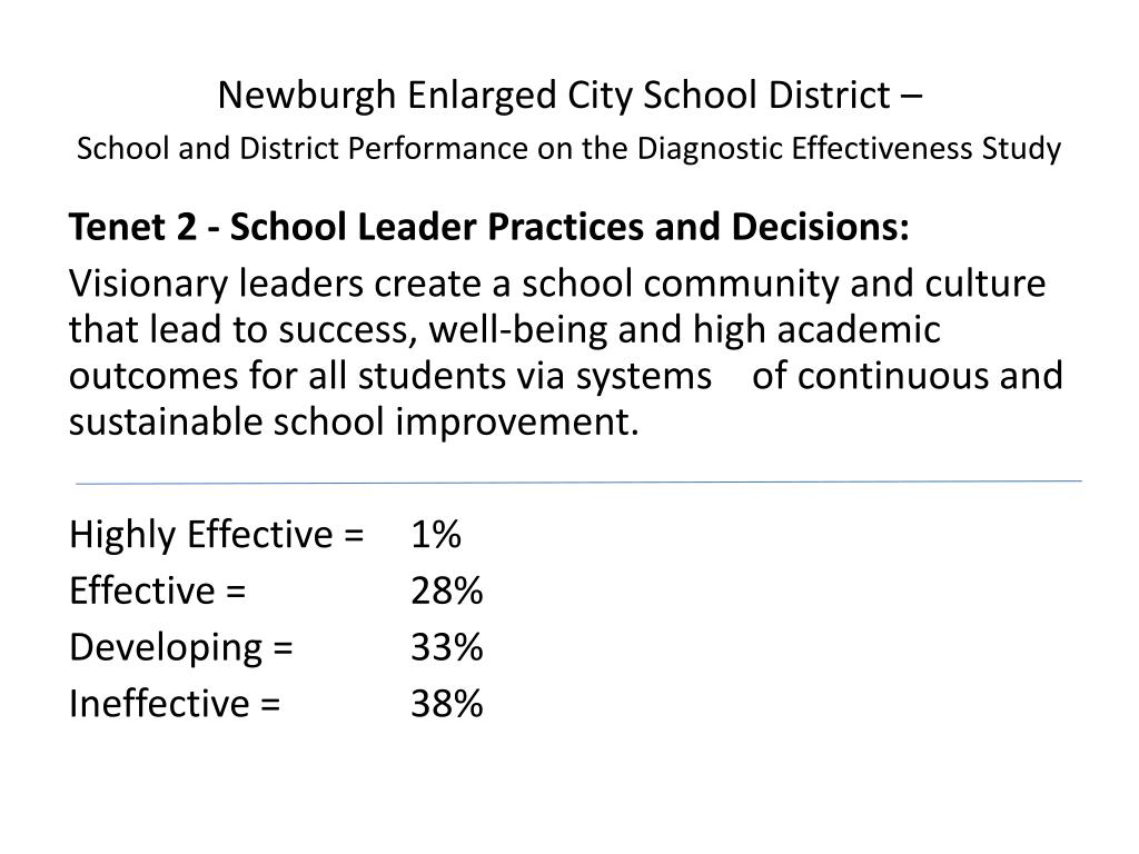 Newburgh Enlarged City School District –School and District Performance on the Diagnostic Effectiveness Study Tenet 2 ‐ School Leader Practices and Decisions: Visionary leaders create a school community and culture that lead to success, well‐being and high academic outcomes for all students via systems of continuous and sustainable school improvement. Highly Effective = 1% Effective = 28% Developing = 33% Ineffective = 38%