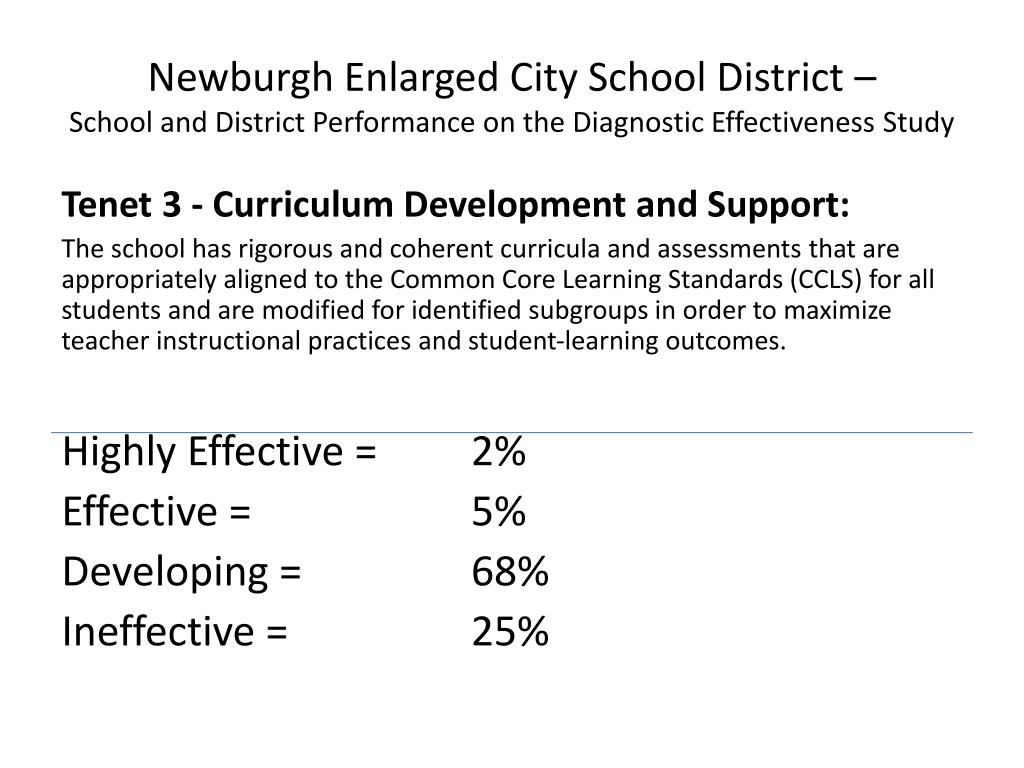 Newburgh Enlarged City School District – School and District Performance on the Diagnostic Effectiveness Study Tenet 3 ‐ Curriculum Development and Support: The school has rigorous and coherent curricula and assessments that are appropriately aligned to the Common Core Learning Standards (CCLS) for all students and are modified for identified subgroups in order to maximize teacher instructional practices and student‐learning outcomes. Highly Effective = 2% Effective = 5% Developing = 68% Ineffective = 25%