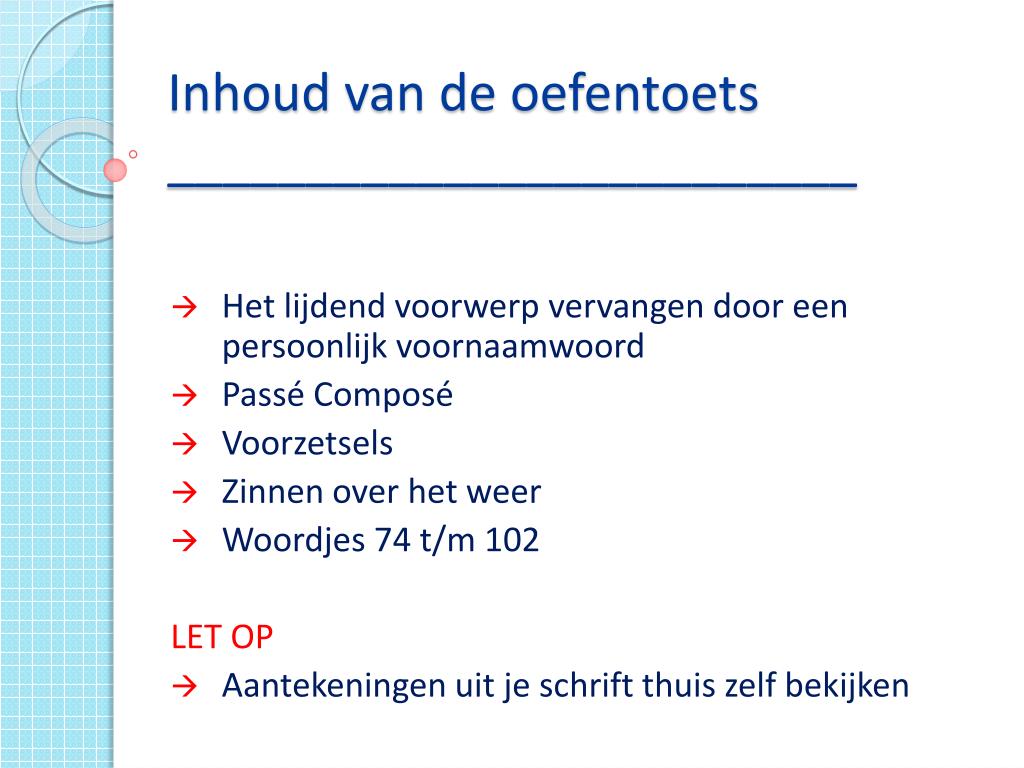 Inhoud van de oefentoets_________________________ Het lijdend voorwerp vervangen door een persoonlijk voornaamwoord Passé Composé Voorzetsels Zinnen over het weer Woordjes 74 t/m 102 LET OP Aantekeningen uit je schrift thuis zelf bekijken