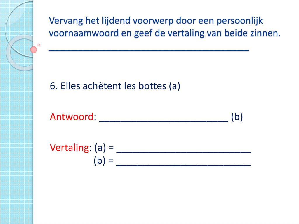 Vervanghetlijdendvoorwerpdooreenpersoonlijkvoornaamwoord en geef de vertaling van beidezinnen.___________________________________ 6. Elles achètent les bottes (a) Antwoord: ________________________ (b) Vertaling: (a) = _________________________ (b) = _________________________