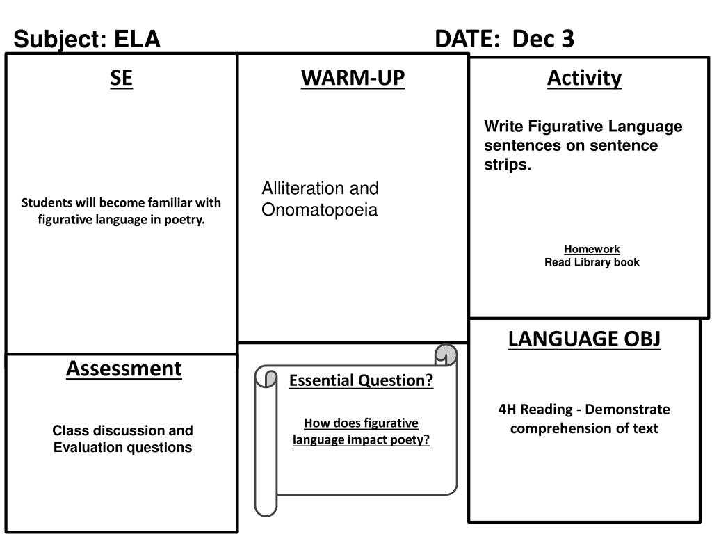 Subject: ELADATE:Dec 3 Students will become familiar with figurative language in poetry. SE WARM-UP Activity Write Figurative Language sentences on sentence strips. Alliteration and Onomatopoeia Homework Read Library book 4H Reading - Demonstrate comprehension of text LANGUAGE OBJ Essential Question? How does figurative language impact poety? Assessment Class discussion and Evaluation questions