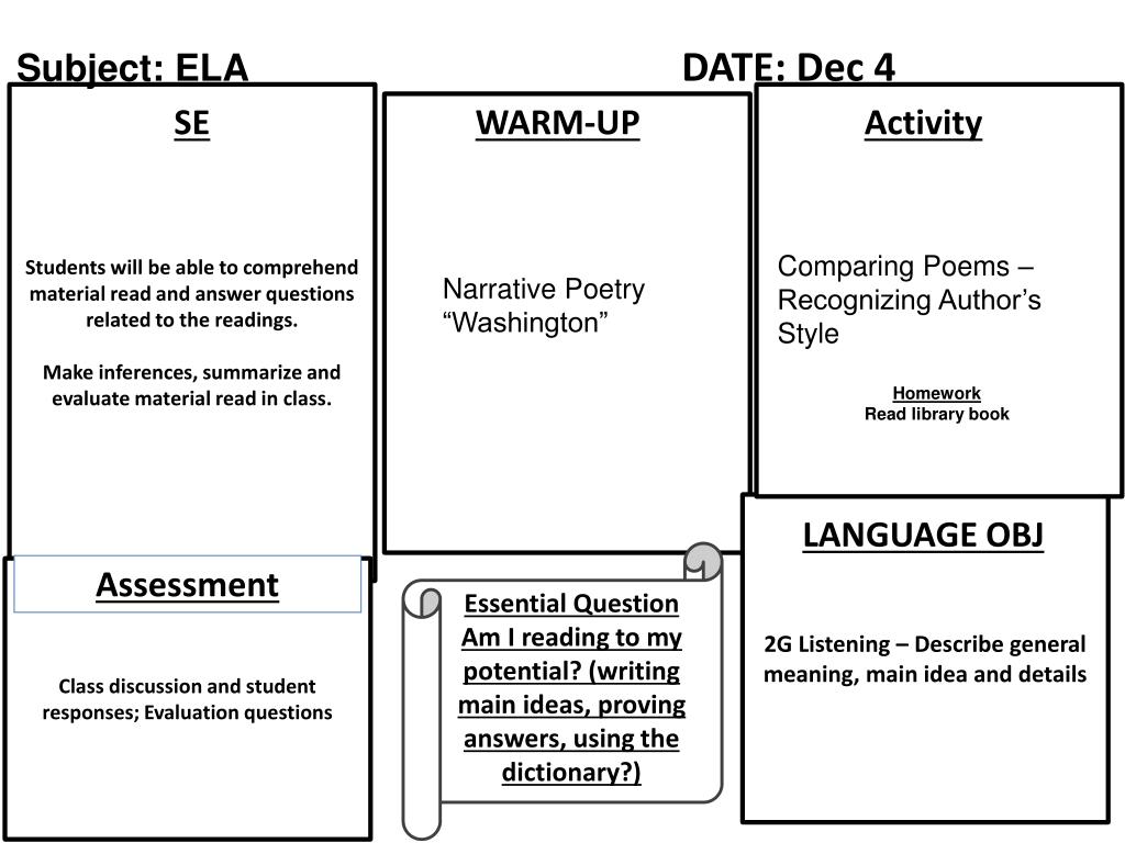 Subject: ELADATE: Dec 4 Students will be able to comprehend material read and answer questions related to the readings. Make inferences, summarize and evaluate material read in class. SE WARM-UP Activity Comparing Poems – Recognizing Author’s Style Narrative Poetry “Washington” Homework Read library book 2G Listening – Describe general meaning, main idea and details LANGUAGE OBJ Essential Question Am I reading to my potential? (writing main ideas, proving answers, using the dictionary?) Assessment Class discussion and student responses; Evaluation questions