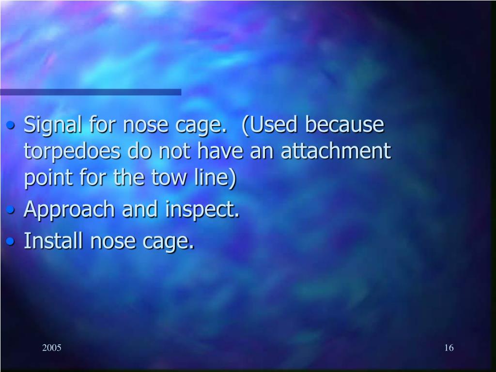 Signal for nose cage. (Used because torpedoes do not have an attachment point for the tow line) Approach and inspect. Install nose cage.