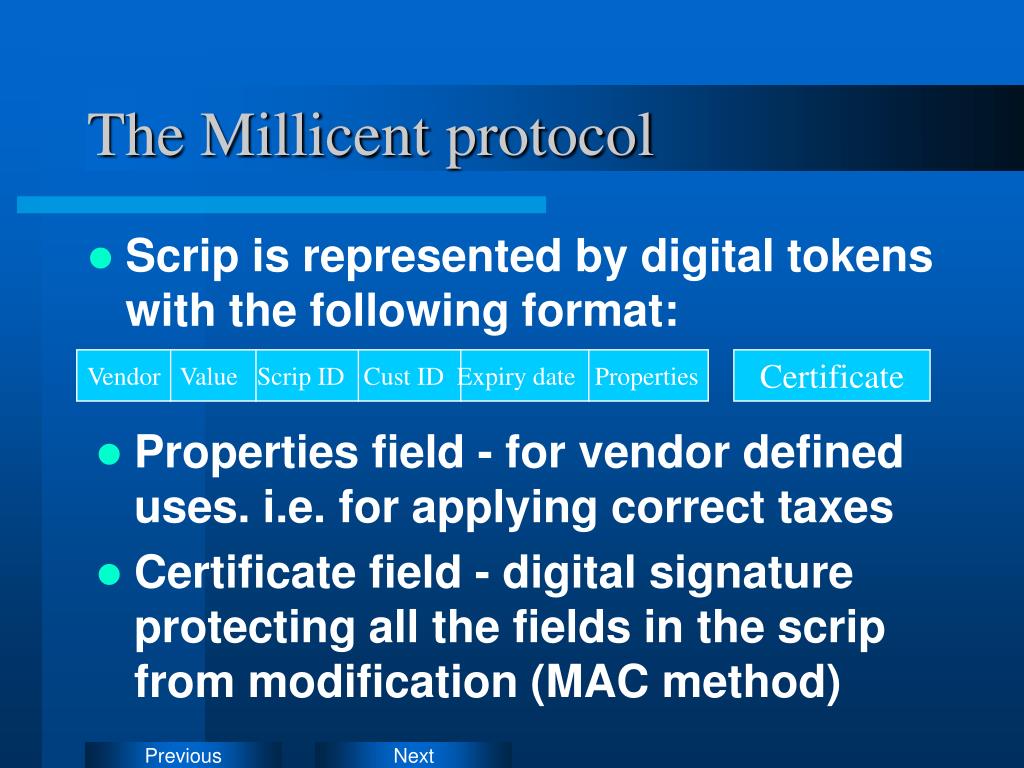 The Millicent protocol • Scrip is designed to offer the following features: • it has value only at a specific vendor • it can be spent only once • it is tamper-resistant and hard to counterfeit • it can be spent only by its rightful owner • it can be produced and validated efficiently