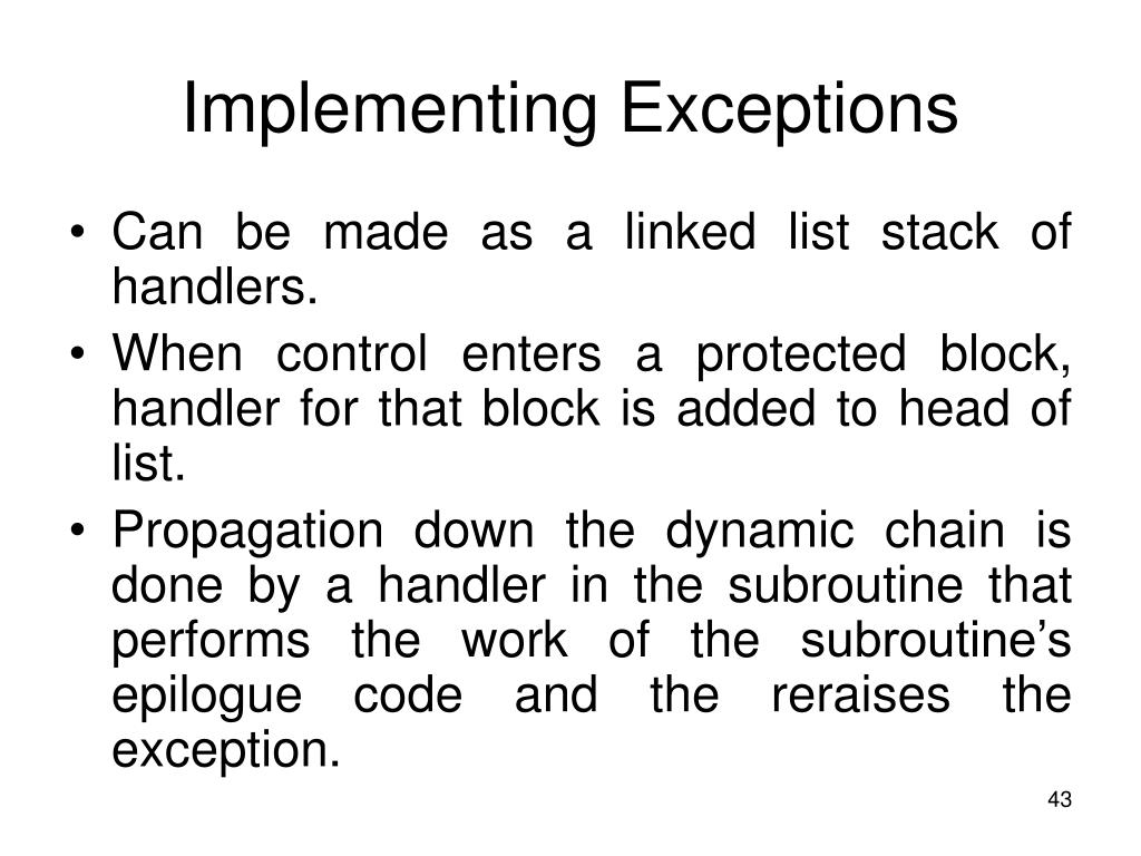 Implementing Exceptions • Can be made as a linked list stack of handlers. • When control enters a protected block, handler for that block is added to head of list. • Propagation down the dynamic chain is done by a handler in the subroutine that performs the work of the subroutine’s epilogue code and the reraises the exception.
