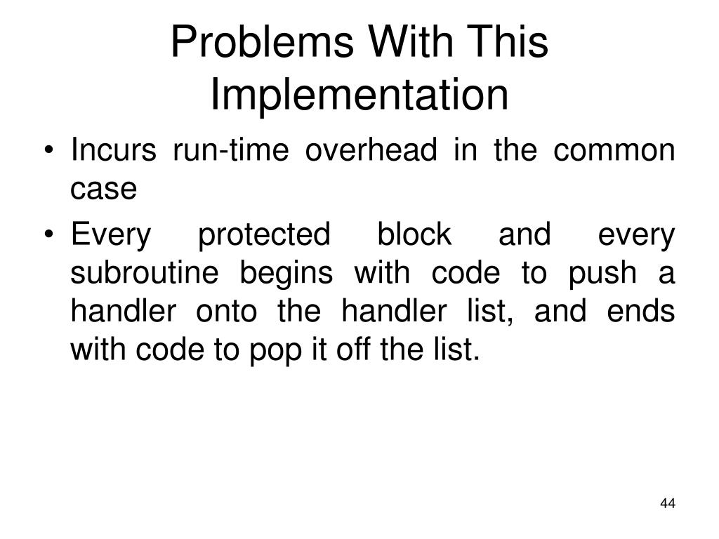 Problems With This Implementation • Incurs run-time overhead in the common case • Every protected block and every subroutine begins with code to push a handler onto the handler list, and ends with code to pop it off the list.