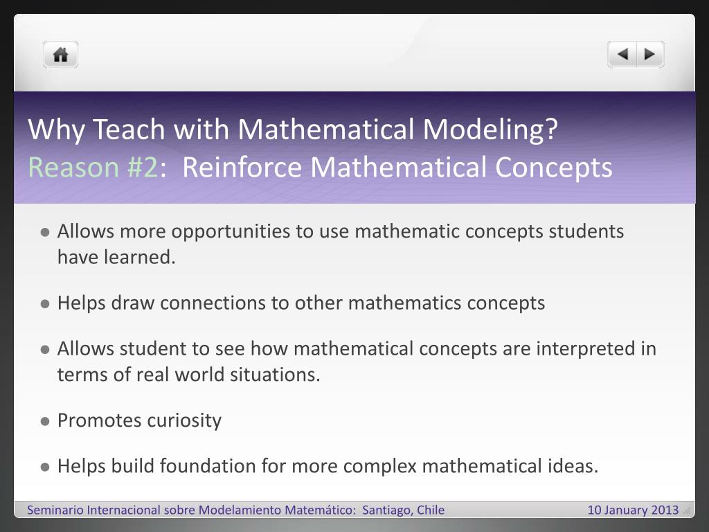 Why Teach with Mathematical Modeling?Reason #2: Reinforce Mathematical Concepts • Allows more opportunities to use mathematic concepts students have learned. • Helps draw connections to other mathematics concepts • Allows student to see how mathematical concepts are interpreted in terms of real world situations. • Promotes curiosity • Helps build foundation for more complex mathematical ideas. SeminarioInternacionalsobreModelamientoMatemático: Santiago, Chile