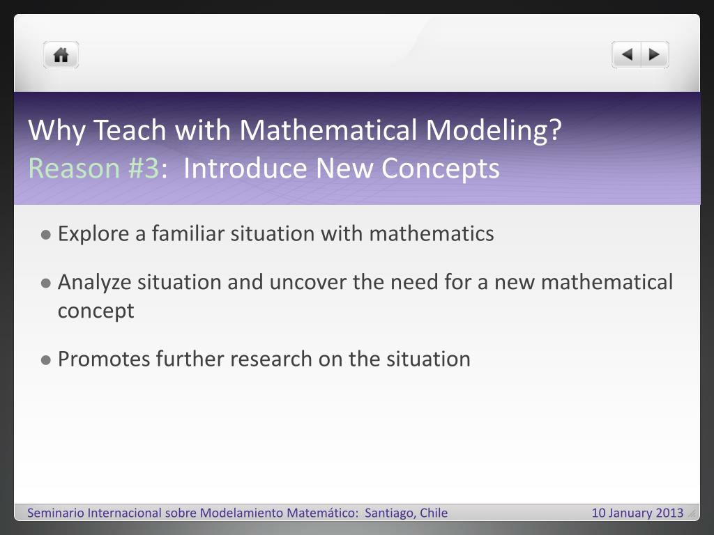 Why Teach with Mathematical Modeling?Reason #3: Introduce New Concepts • Explore a familiar situation with mathematics • Analyze situation and uncover the need for a new mathematical concept • Promotes further research on the situation SeminarioInternacionalsobreModelamientoMatemático: Santiago, Chile