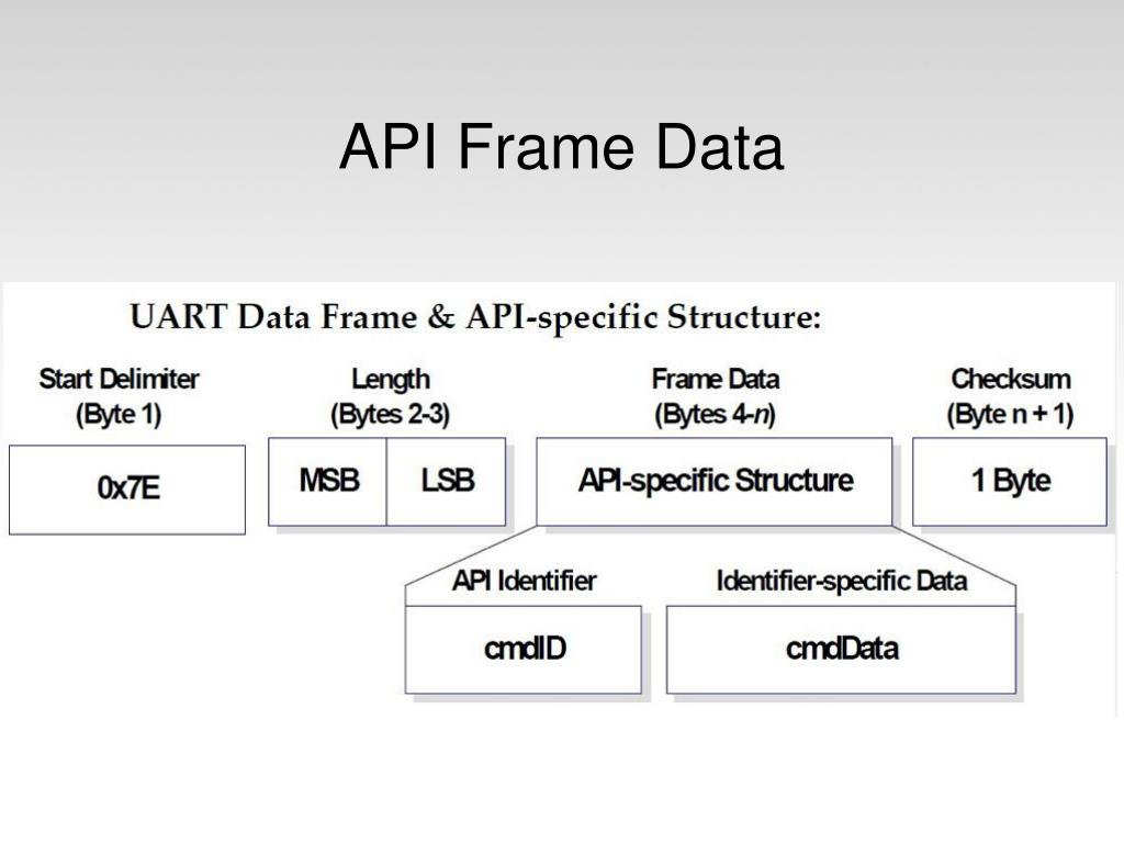 API Mode? Application Programing Interface For computers to talk to other computers Structured Predictable Reliable Frames of data Radio must be in API mode ATAP 1 for Series 1 (ATAP 0 to turn off) API firmware for Series 2