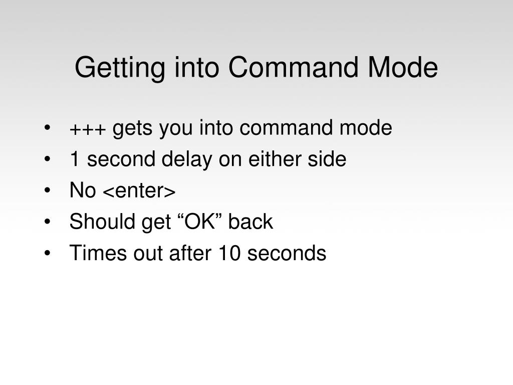 Getting into Command Mode +++ gets you into command mode 1 second delay on either side No <enter> Should get “OK” back Times out after 10 seconds