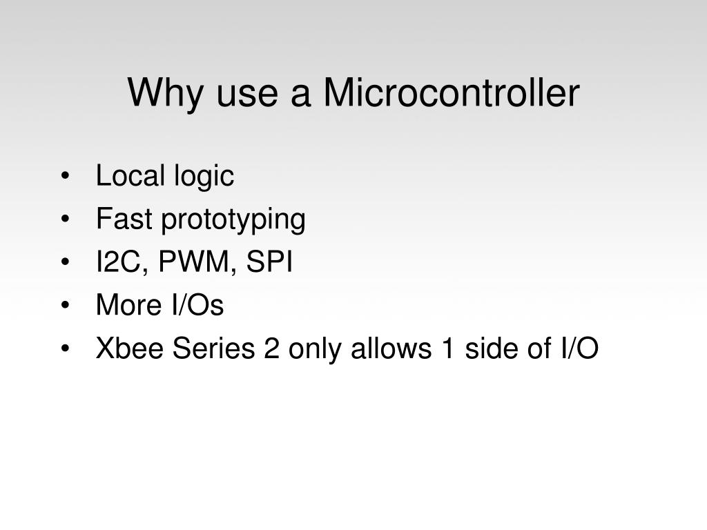 Why use a Microcontroller Local logic Fast prototyping I2C, PWM, SPI More I/Os Xbee Series 2 only allows 1 side of I/O