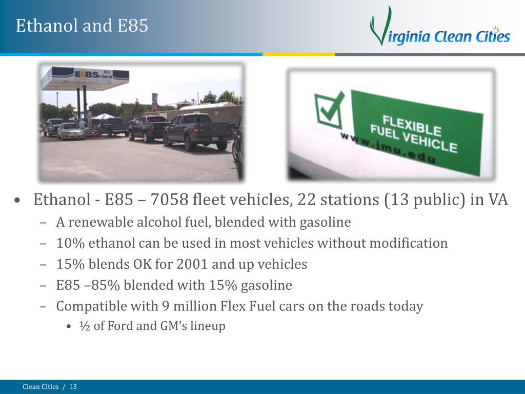 Ethanol and E85 • Ethanol - E85 – 7058 fleet vehicles, 22 stations (13 public) in VA • A renewable alcohol fuel, blended with gasoline • 10% ethanol can be used in most vehicles without modification • 15% blends OK for 2001 and up vehicles • E85 –85% blended with 15% gasoline • Compatible with 9 million Flex Fuel cars on the roads today • ½ of Ford and GM’s lineup