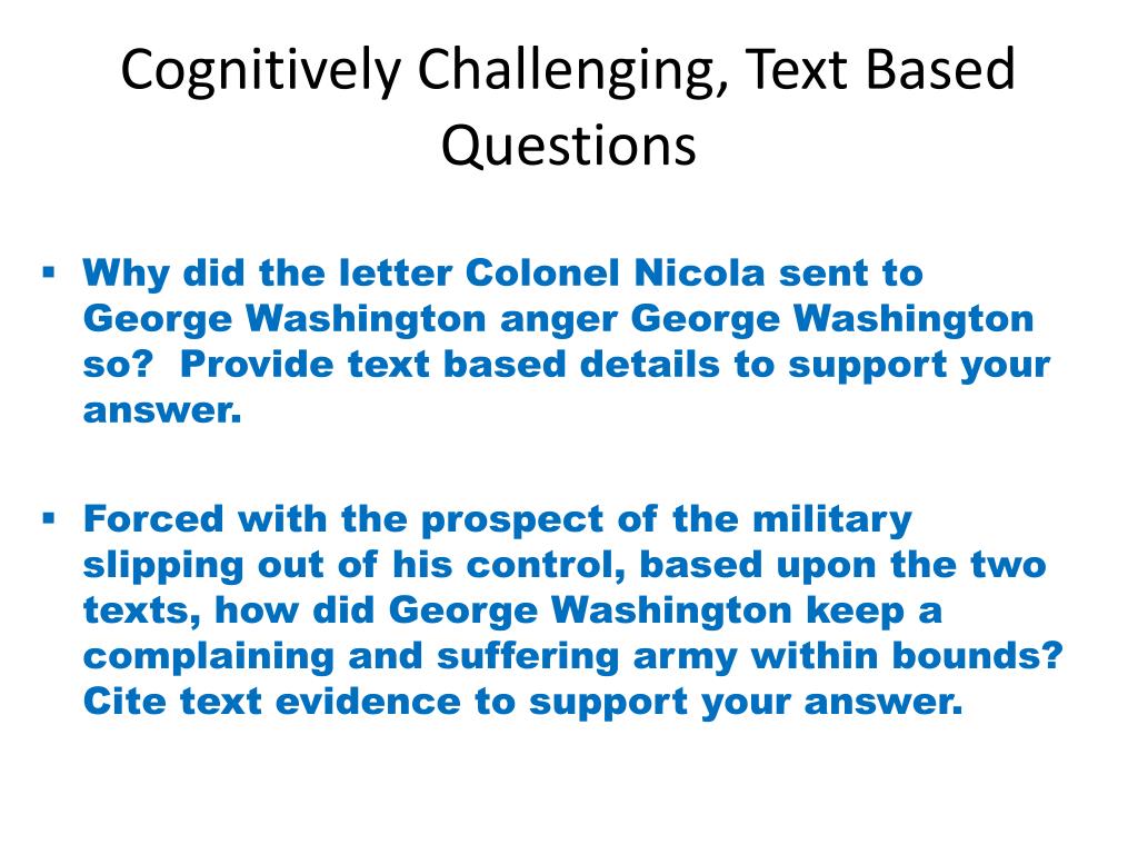 Cognitively Challenging, Text Based Questions • Why did the letter Colonel Nicola sent to George Washington anger George Washington so? Provide text based details to support your answer. • Forced with the prospect of the military slipping out of his control, based upon the two texts, how did George Washington keep a complaining and suffering army within bounds? Cite text evidence to support your answer.