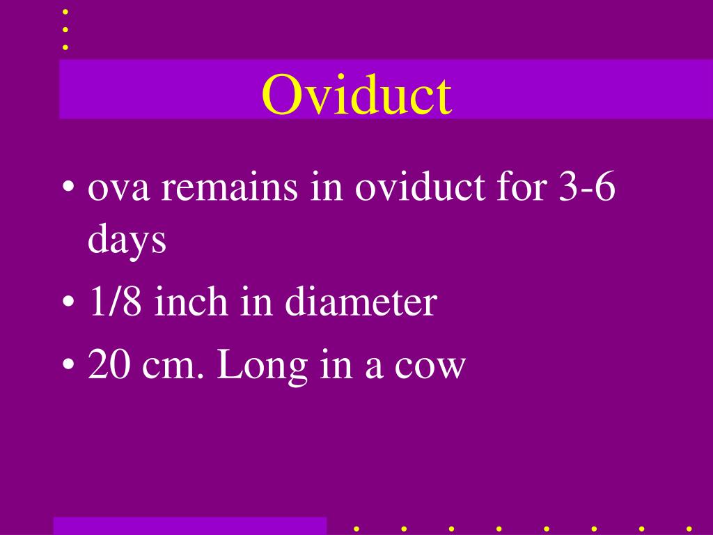 Oviduct • ova remains in oviduct for 3-6 days • 1/8 inch in diameter • 20 cm. Long in a cow