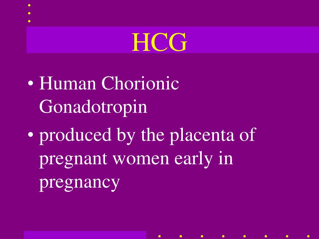 HCG • Human Chorionic Gonadotropin • produced by the placenta of pregnant women early in pregnancy