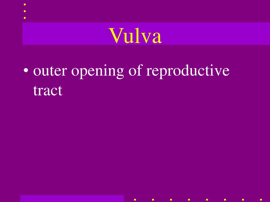 Vagina • point where urinary and reproductive tracts join • receptacle for semen • passageway for fetus