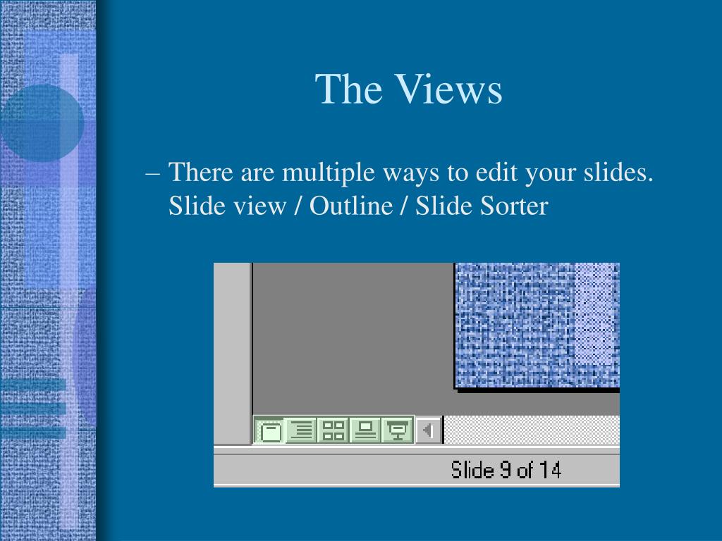 The Views • There are multiple ways to edit your slides. Slide view / Outline / Slide Sorter