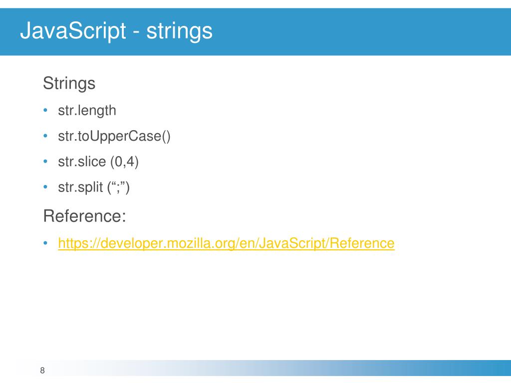JavaScript - strings • Strings • str.length • str.toUpperCase() • str.slice (0,4) • str.split (“;”) • Reference: • https://developer.mozilla.org/en/JavaScript/Reference