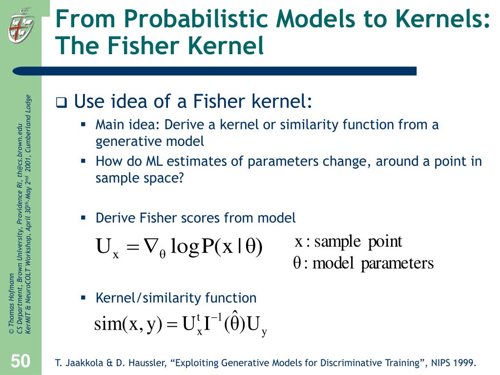 From Probabilistic Models to Kernels: The Fisher Kernel • Use idea of a Fisher kernel: • Main idea: Derive a kernel or similarity function from a generative model • How do ML estimates of parameters change, around a point in sample space? • Derive Fisher scores from model • Kernel/similarity function T. Jaakkola & D. Haussler, “Exploiting Generative Models for Discriminative Training”, NIPS 1999.