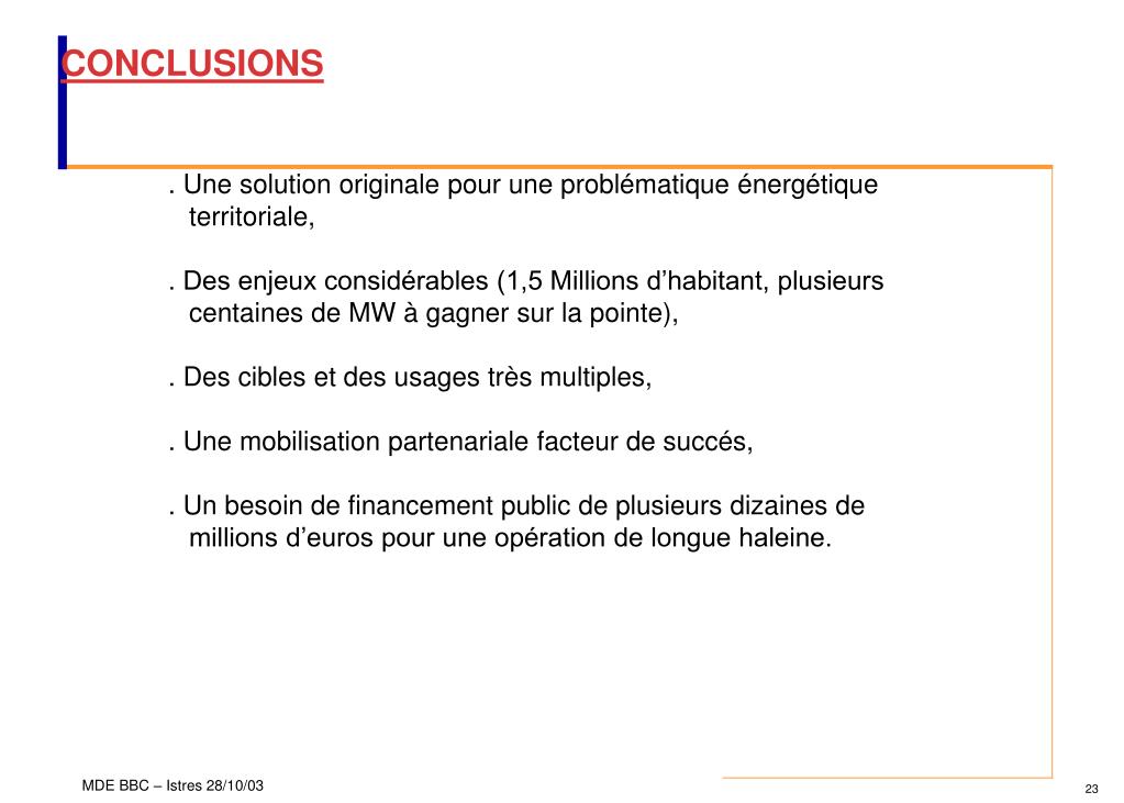 CONCLUSIONS . Une solution originale pour une problématique énergétique territoriale, . Des enjeux considérables (1,5 Millions d’habitant, plusieurs centaines de MW à gagner sur la pointe), . Des cibles et des usages très multiples, . Une mobilisation partenariale facteur de succés, . Un besoin de financement public de plusieurs dizaines de millions d’euros pour une opération de longue haleine.