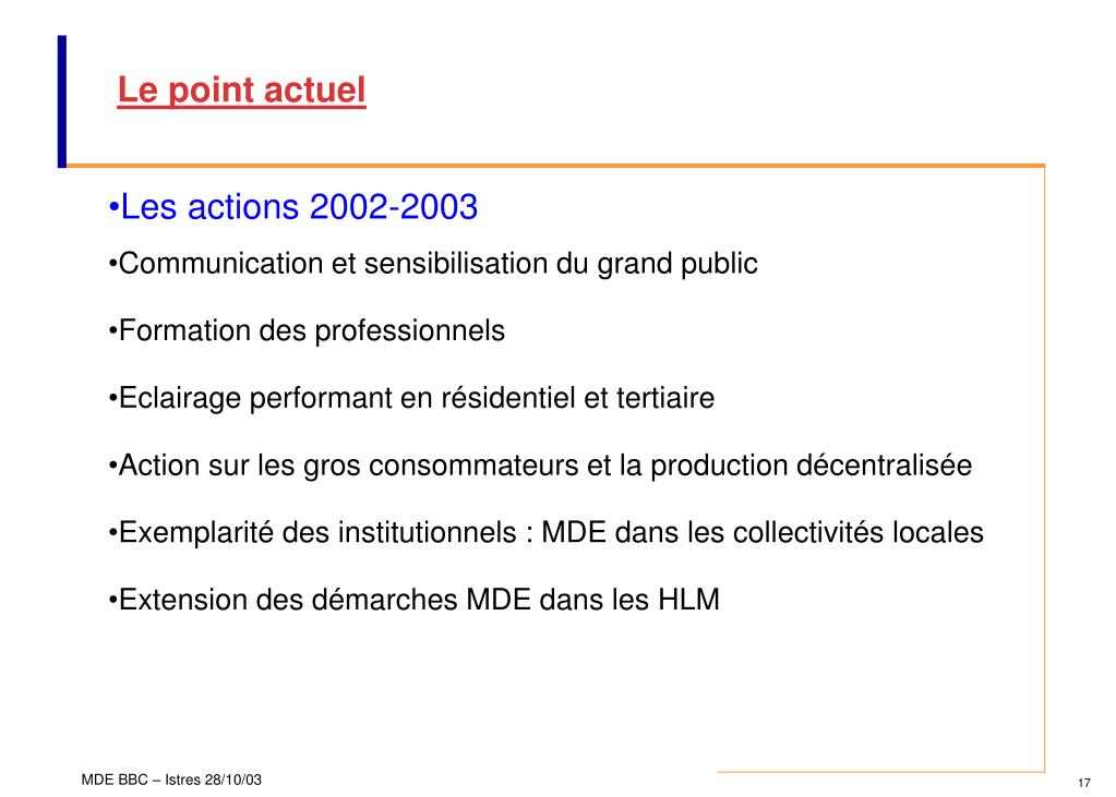 Le point actuel • Les actions 2002-2003 • Communication et sensibilisation du grand public • Formation des professionnels • Eclairage performant en résidentiel et tertiaire • Action sur les gros consommateurs et la production décentralisée • Exemplarité des institutionnels : MDE dans les collectivités locales • Extension des démarches MDE dans les HLM