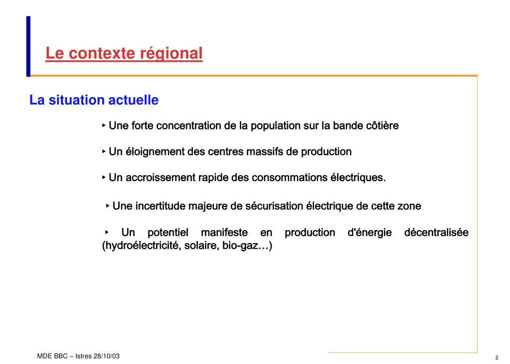 Le contexte régional La situation actuelle • ‣ Une forte concentration de la population sur la bande côtière • ‣ Un éloignement des centres massifs de production • ‣ Un accroissement rapide des consommations électriques. • ‣ Une incertitude majeure de sécurisation électrique de cette zone ‣ Un potentiel manifeste en production d'énergie décentralisée (hydroélectricité, solaire, bio-gaz…)