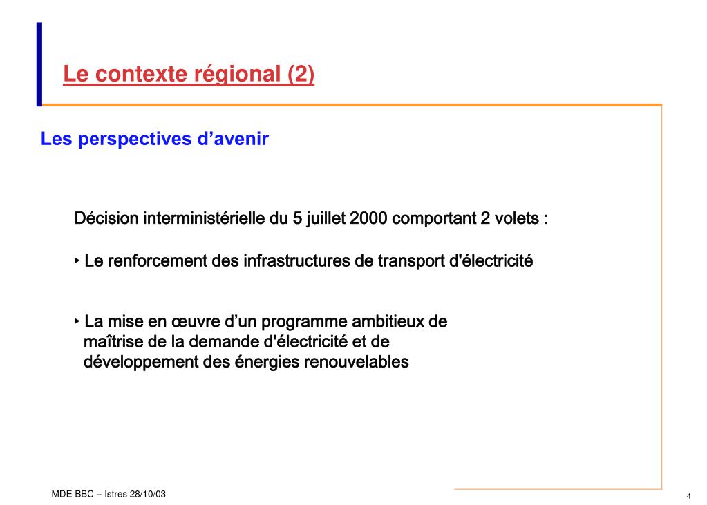 Le contexte régional (2) Les perspectives d’avenir • Décision interministérielle du 5 juillet 2000 comportant 2 volets : • ‣ Le renforcement des infrastructures de transport d'électricité ‣ La mise en œuvre d’un programme ambitieux de maîtrise de la demande d'électricité et de développement des énergies renouvelables