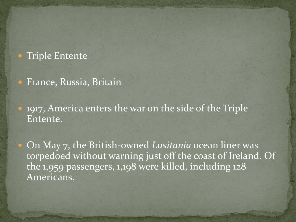 Triple Entente • France, Russia, Britain • 1917, America enters the war on the side of the Triple Entente. • On May 7, the British-owned Lusitania ocean liner was torpedoed without warning just off the coast of Ireland. Of the 1,959 passengers, 1,198 were killed, including 128 Americans.