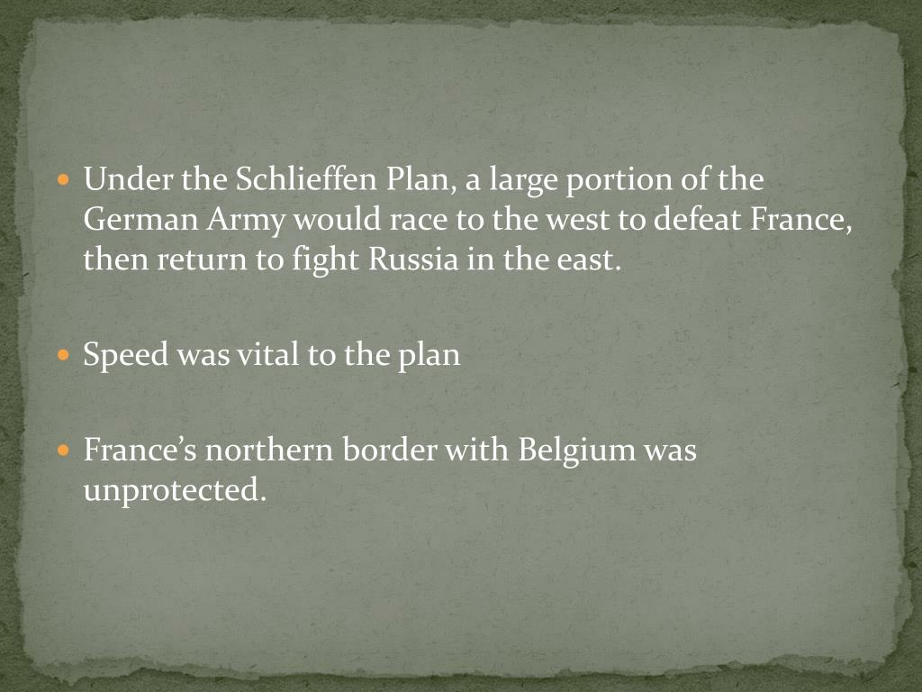 Under the Schlieffen Plan, a large portion of the German Army would race to the west to defeat France, then return to fight Russia in the east. • Speed was vital to the plan • France’s northern border with Belgium was unprotected.