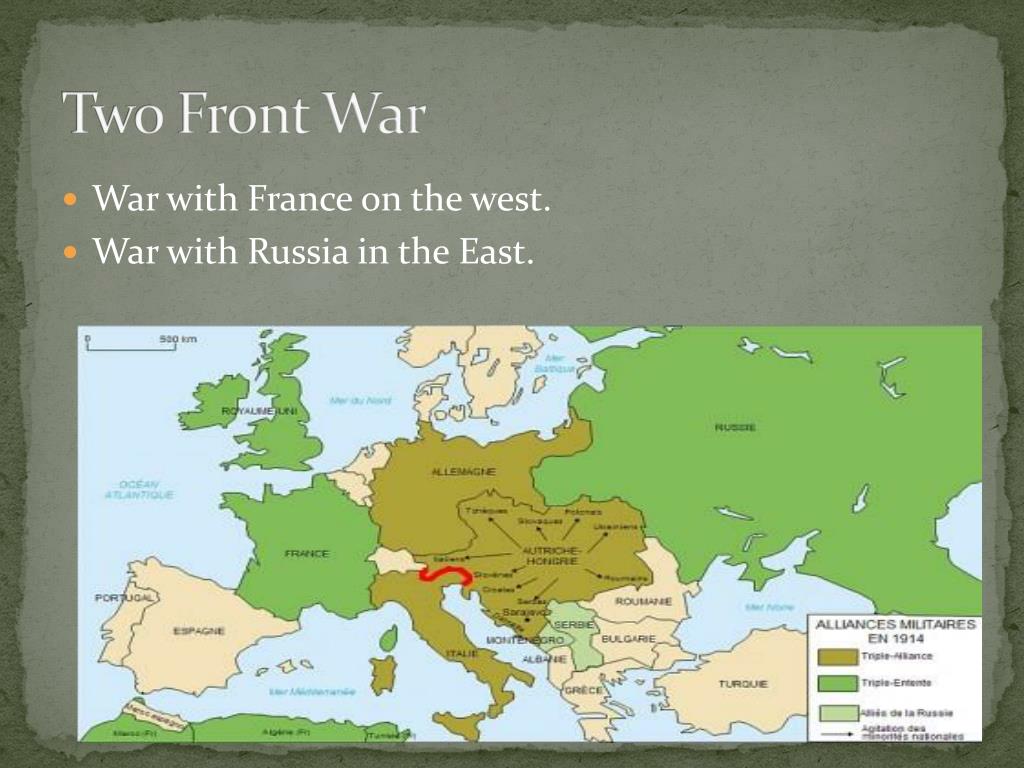 The Schlieffen Plan • Plan designed by General Alfred Graf von Schlieffen. • In the event of a two front war, the Schlieffen Plan called for Germany to attack France first. • He had reason to believe that because Russia lacked railroads, they would have trouble mobilizing troops.