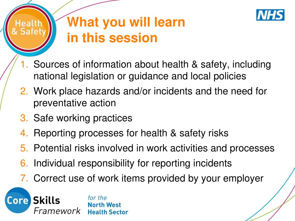 What you will learn in this session. Sources of information about health & safety, including national legislation or guidance and local policies Work place hazards and/or incidents and the need for preventative action Safe working practices Reporting processes for health & safety risks