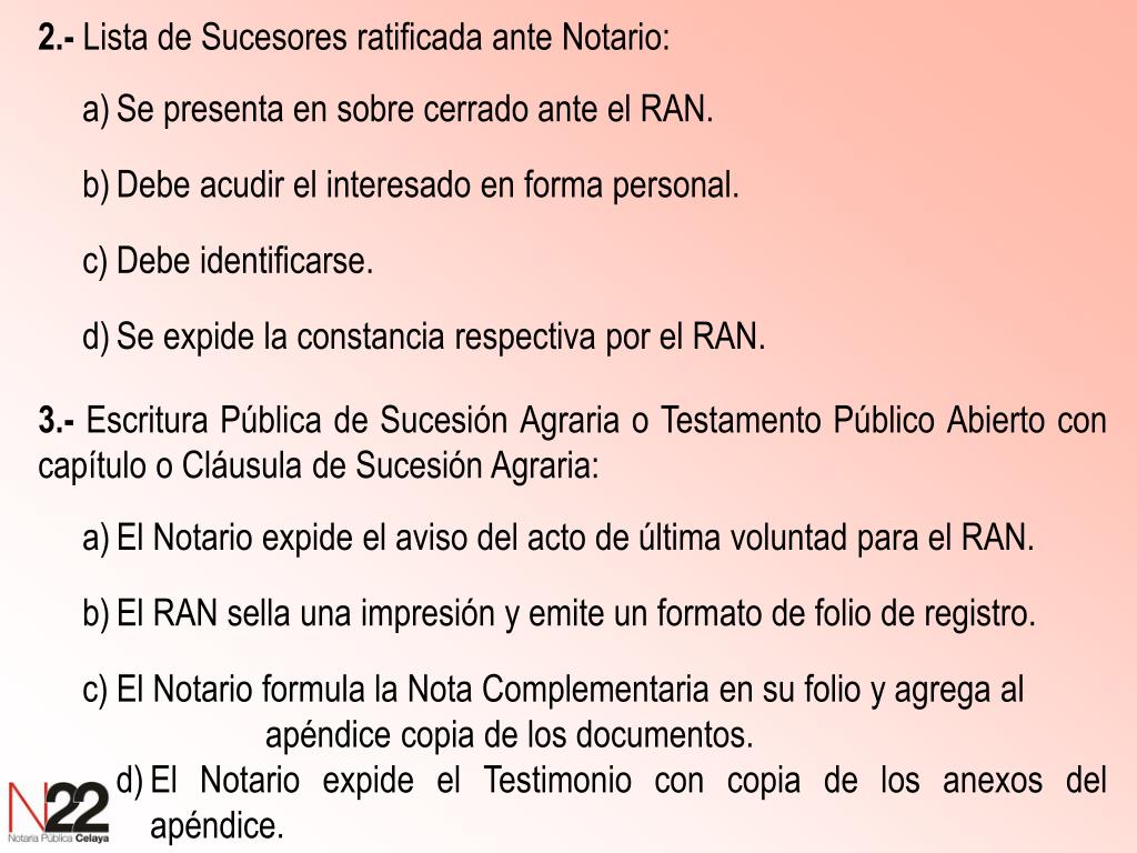 2.- Lista de Sucesores ratificada ante Notario: • Se presenta en sobre cerrado ante el RAN. • Debe acudir el interesado en forma personal. • Debe identificarse. • Se expide la constancia respectiva por el RAN. • 3.- Escritura Pública de Sucesión Agraria o Testamento Público Abierto con capítulo o Cláusula de Sucesión Agraria: • El Notario expide el aviso del acto de última voluntad para el RAN. • El RAN sella una impresión y emite un formato de folio de registro. • El Notario formula la Nota Complementaria en su folio y agrega al apéndice copia de los documentos. • El Notario expide el Testimonio con copia de los anexos del apéndice.