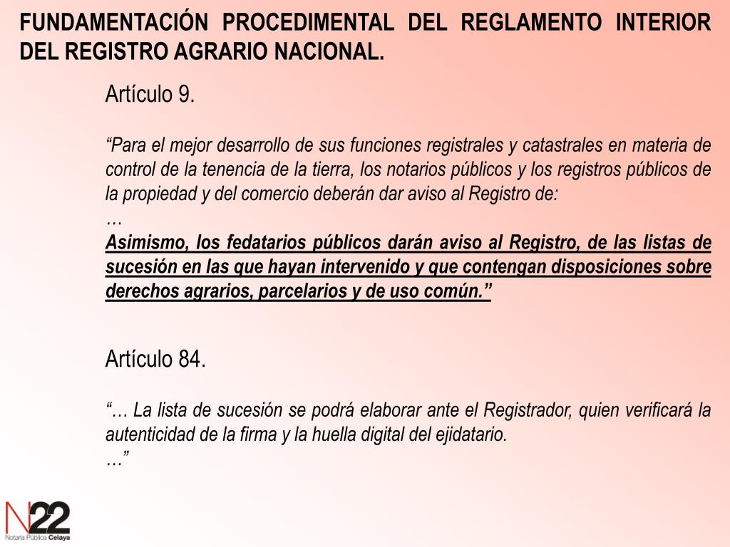 FUNDAMENTACIÓN PROCEDIMENTAL DEL REGLAMENTO INTERIOR DEL REGISTRO AGRARIO NACIONAL. Artículo 9. “Para el mejor desarrollo de sus funciones registrales y catastrales en materia de control de la tenencia de la tierra, los notarios públicos y los registros públicos de la propiedad y del comercio deberán dar aviso al Registro de: … Asimismo, los fedatarios públicos darán aviso al Registro, de las listas de sucesión en las que hayan intervenido y que contengan disposiciones sobre derechos agrarios, parcelarios y de uso común.” Artículo 84. “… La lista de sucesión se podrá elaborar ante el Registrador, quien verificará la autenticidad de la firma y la huella digital del ejidatario. …”