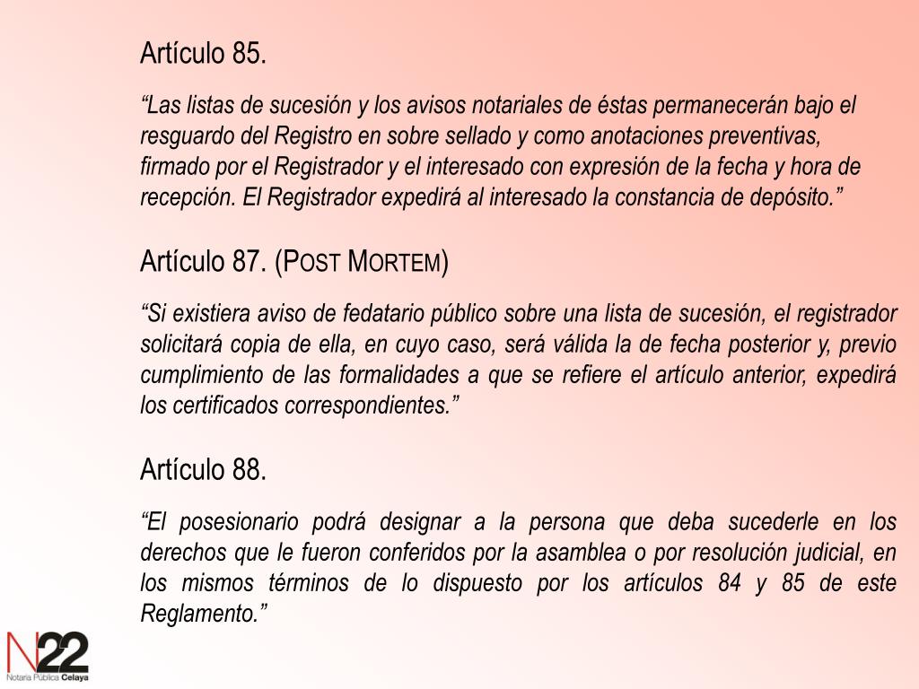 Artículo 85. “Las listas de sucesión y los avisos notariales de éstas permanecerán bajo el resguardo del Registro en sobre sellado y como anotaciones preventivas, firmado por el Registrador y el interesado con expresión de la fecha y hora de recepción. El Registrador expedirá al interesado la constancia de depósito.” Artículo 87. (Post Mortem) “Si existiera aviso de fedatario público sobre una lista de sucesión, el registrador solicitará copia de ella, en cuyo caso, será válida la de fecha posterior y, previo cumplimiento de las formalidades a que se refiere el artículo anterior, expedirá los certificados correspondientes.” Artículo 88. “El posesionario podrá designar a la persona que deba sucederle en los derechos que le fueron conferidos por la asamblea o por resolución judicial, en los mismos términos de lo dispuesto por los artículos 84 y 85 de este Reglamento.”