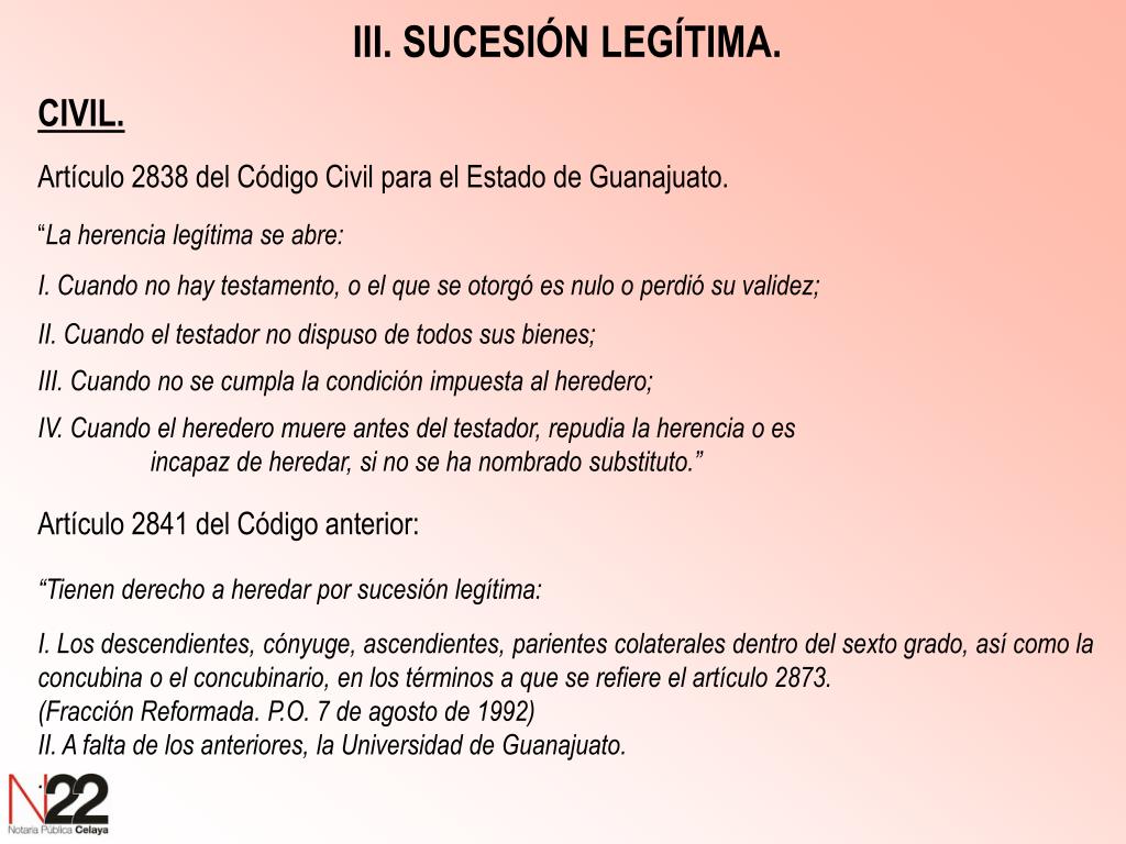 III. SUCESIÓN LEGÍTIMA. CIVIL. Artículo 2838 del Código Civil para el Estado de Guanajuato. “La herencia legítima se abre: I. Cuando no hay testamento, o el que se otorgó es nulo o perdió su validez; II. Cuando el testador no dispuso de todos sus bienes; III. Cuando no se cumpla la condición impuesta al heredero; IV. Cuando el heredero muere antes del testador, repudia la herencia o es incapaz de heredar, si no se ha nombrado substituto.” Artículo 2841 del Código anterior: “Tienen derecho a heredar por sucesión legítima: I. Los descendientes, cónyuge, ascendientes, parientes colaterales dentro del sexto grado, así como la concubina o el concubinario, en los términos a que se refiere el artículo 2873. (Fracción Reformada. P.O. 7 de agosto de 1992) II. A falta de los anteriores, la Universidad de Guanajuato. .