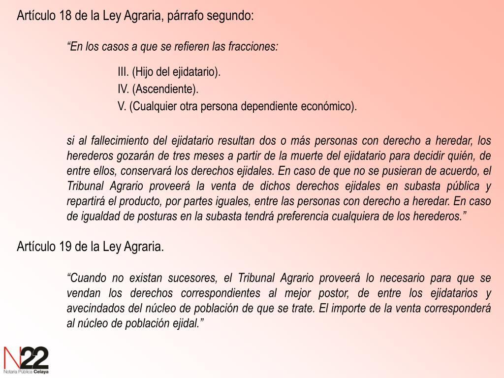 Artículo 18 de la Ley Agraria, párrafo segundo: “En los casos a que se refieren las fracciones: III. (Hijo del ejidatario). IV. (Ascendiente). V. (Cualquier otra persona dependiente económico). si al fallecimiento del ejidatario resultan dos o más personas con derecho a heredar, los herederos gozarán de tres meses a partir de la muerte del ejidatario para decidir quién, de entre ellos, conservará los derechos ejidales. En caso de que no se pusieran de acuerdo, el Tribunal Agrario proveerá la venta de dichos derechos ejidales en subasta pública y repartirá el producto, por partes iguales, entre las personas con derecho a heredar. En caso de igualdad de posturas en la subasta tendrá preferencia cualquiera de los herederos.” Artículo 19 de la Ley Agraria. “Cuando no existan sucesores, el Tribunal Agrario proveerá lo necesario para que se vendan los derechos correspondientes al mejor postor, de entre los ejidatarios y avecindados del núcleo de población de que se trate. El importe de la venta corresponderá al núcleo de población ejidal.”