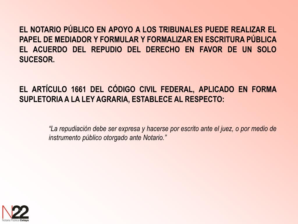 EL NOTARIO PÚBLICO EN APOYO A LOS TRIBUNALES PUEDE REALIZAR EL PAPEL DE MEDIADOR Y FORMULAR Y FORMALIZAR EN ESCRITURA PÚBLICA EL ACUERDO DEL REPUDIO DEL DERECHO EN FAVOR DE UN SOLO SUCESOR. EL ARTÍCULO 1661 DEL CÓDIGO CIVIL FEDERAL, APLICADO EN FORMA SUPLETORIA A LA LEY AGRARIA, ESTABLECE AL RESPECTO: “La repudiación debe ser expresa y hacerse por escrito ante el juez, o por medio de instrumento público otorgado ante Notario.”