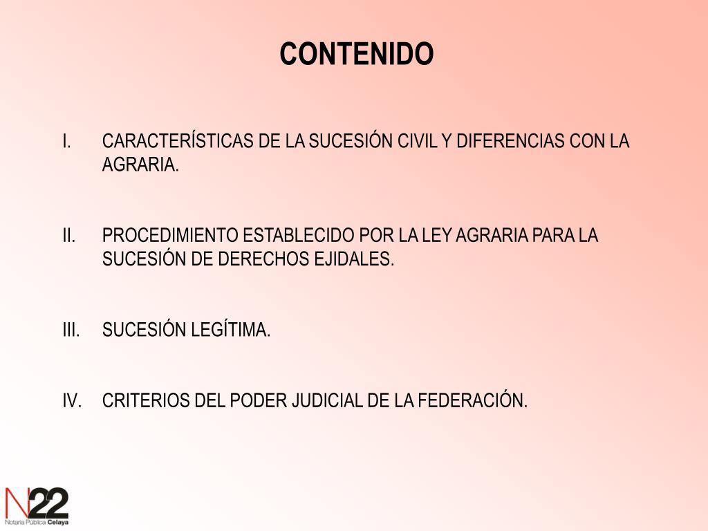 CONTENIDO CARACTERÍSTICAS DE LA SUCESIÓN CIVIL Y DIFERENCIAS CON LA AGRARIA. PROCEDIMIENTO ESTABLECIDO POR LA LEY AGRARIA PARA LA SUCESIÓN DE DERECHOS EJIDALES. SUCESIÓN LEGÍTIMA. CRITERIOS DEL PODER JUDICIAL DE LA FEDERACIÓN.