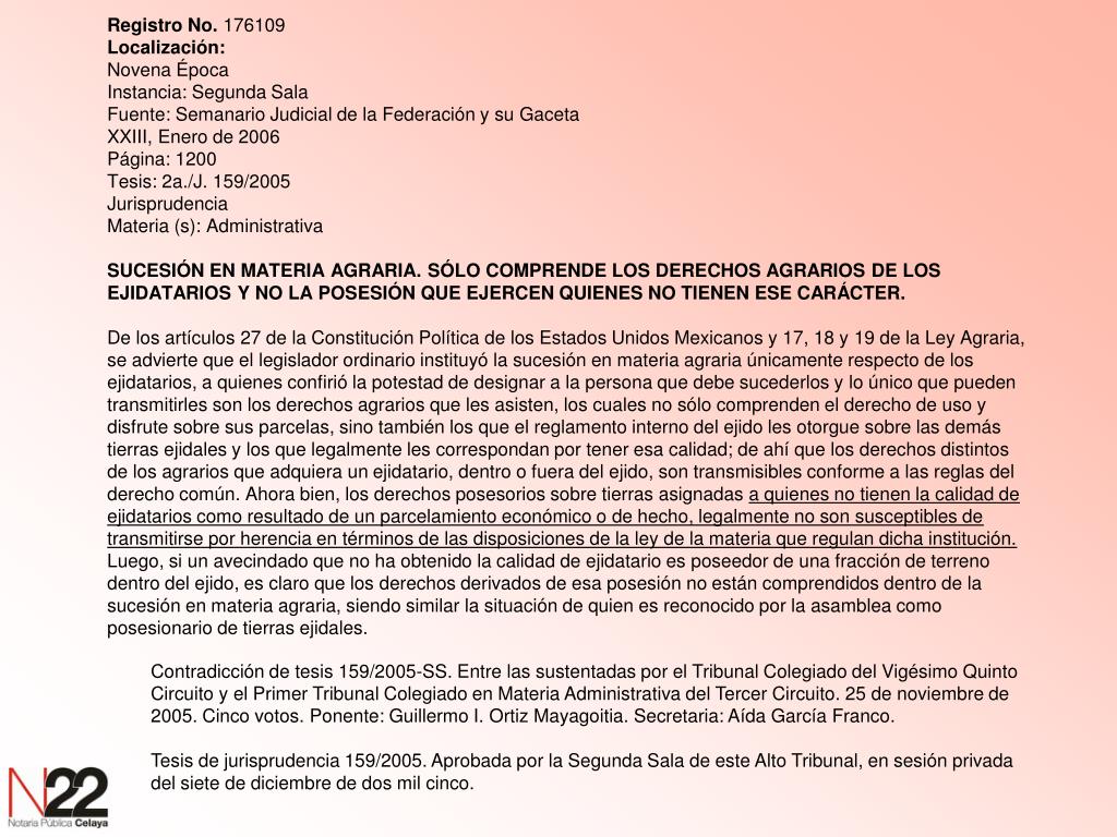 “LA SUCESIÓN AGRARIA”. LIC. MIGUEL RAMÍREZ SILVA. CONTENIDO CARACTERÍSTICAS DE LA SUCESIÓN CIVIL Y DIFERENCIAS CON LA AGRARIA. PROCEDIMIENTO ESTABLECIDO POR LA LEY AGRARIA PARA LA SUCESIÓN DE DERECHOS EJIDALES. SUCESIÓN LEGÍTIMA. CRITERIOS DEL PODER JUDICIAL DE LA FEDERACIÓN.