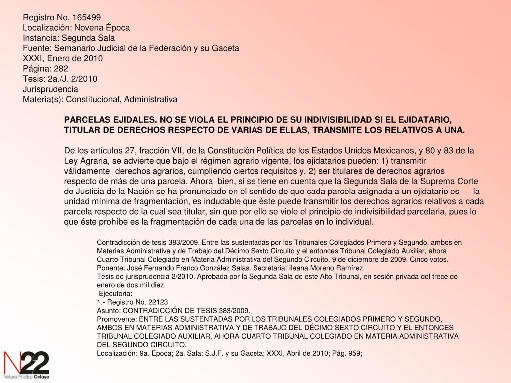 Registro No. 165499Localización: Novena ÉpocaInstancia: Segunda SalaFuente: Semanario Judicial de la Federación y su GacetaXXXI, Enero de 2010Página: 282Tesis: 2a./J. 2/2010JurisprudenciaMateria(s): Constitucional, AdministrativaPARCELAS EJIDALES. NO SE VIOLA EL PRINCIPIO DE SU INDIVISIBILIDAD SI EL EJIDATARIO, TITULAR DE DERECHOS RESPECTO DE VARIAS DE ELLAS, TRANSMITE LOS RELATIVOS A UNA. De los artículos 27, fracción VII, de la Constitución Política de los Estados Unidos Mexicanos, y 80 y 83 de la Ley Agraria, se advierte que bajo el régimen agrario vigente, los ejidatarios pueden: 1) transmitir válidamente derechos agrarios, cumpliendo ciertos requisitos y, 2) ser titulares de derechos agrarios respecto de más de una parcela. Ahora bien, si se tiene en cuenta que la Segunda Sala de la Suprema Corte de Justicia de la Nación se ha pronunciado en el sentido de que cada parcela asignada a un ejidatario es la unidad mínima de fragmentación, es indudable que éste puede transmitir los derechos agrarios relativos a cada parcela respecto de la cual sea titular, sin que por ello se viole el principio de indivisibilidad parcelaria, pues lo que éste prohíbe es la fragmentación de cada una de las parcelas en lo individual. Contradicción de tesis 383/2009. Entre las sustentadas por los Tribunales Colegiados Primero y Segundo, ambos en Materias Administrativa y de Trabajo del Décimo Sexto Circuito y el entonces Tribunal Colegiado Auxiliar, ahora Cuarto Tribunal Colegiado en Materia Administrativa del Segundo Circuito. 9 de diciembre de 2009. Cinco votos. Ponente: José Fernando Franco González Salas. Secretaria: Ileana Moreno Ramírez.Tesis de jurisprudencia 2/2010. Aprobada por la Segunda Sala de este Alto Tribunal, en sesión privada del trece de enero de dos mil diez. Ejecutoria:1.- Registro No. 22123Asunto: CONTRADICCIÓN DE TESIS 383/2009. Promovente: ENTRE LAS SUSTENTADAS POR LOS TRIBUNALES COLEGIADOS PRIMERO Y SEGUNDO, AMBOS EN MATERIAS ADMINISTRATIVA Y DE TRABAJO DEL DÉCIMO SEXTO CIRCUITO Y EL ENTONCES TRIBUNAL COLEGIADO AUXILIAR, AHORA CUARTO TRIBUNAL COLEGIADO EN MATERIA ADMINISTRATIVA DEL SEGUNDO CIRCUITO.Localización: 9a. Época; 2a. Sala; S.J.F. y su Gaceta; XXXI, Abril de 2010; Pág. 959;